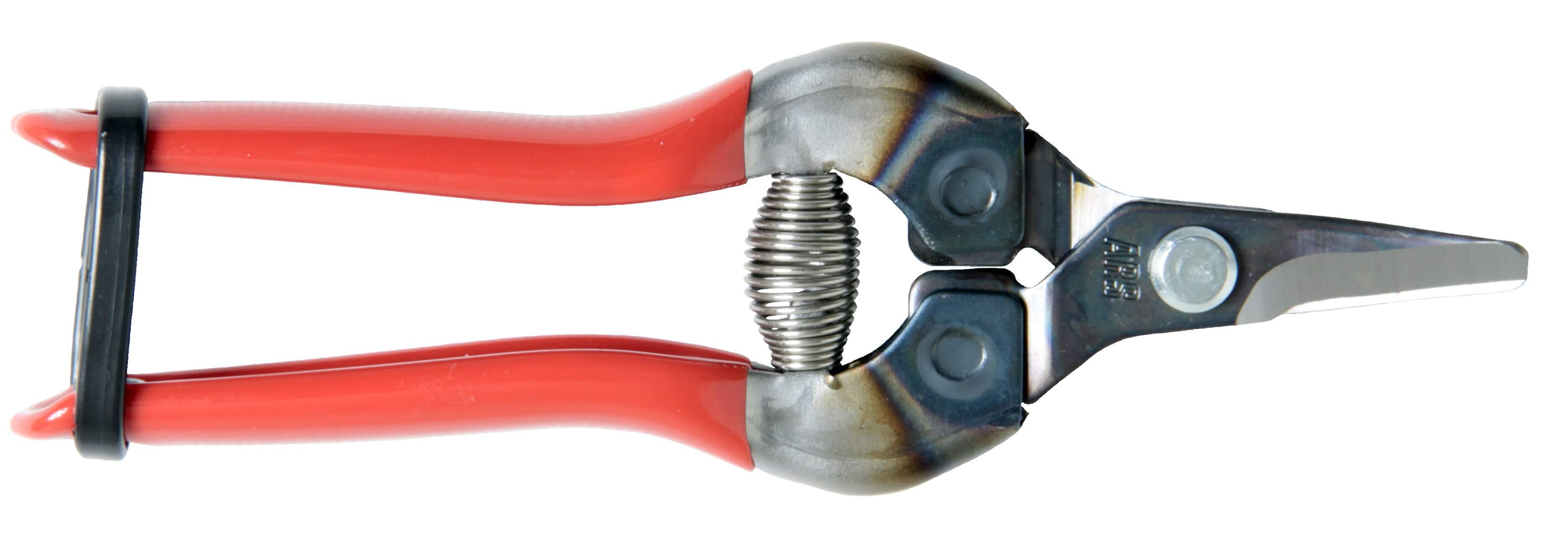 O grande diferencial desse modelo é sua lâmina curvada, que foi projetada especificamente para a colheita, permitindo que o corte seja feito bem próximo à fruta e sem machucá-la. As pontas arredondadas da lâmina também ajudam a proteger a fruta de possíveis danos causados pela ferramenta. Seu cabo é feito de aço e revestido por plástico emborrachado, o que evita que a tesoura deslize durante a sua utilização.